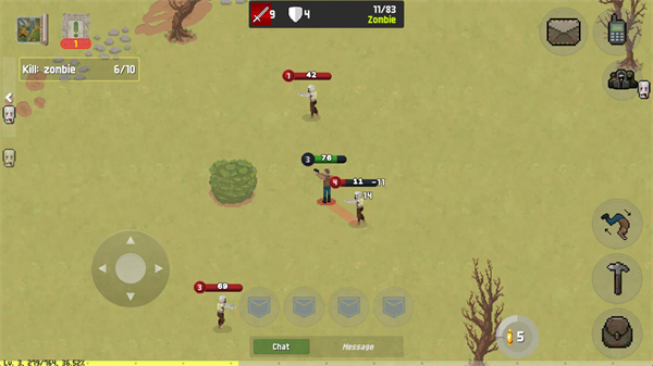 5、当玩家靠近僵尸后会自动攻击,击败僵尸会获得经验和一些随机掉落物。