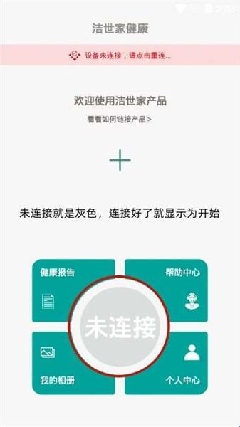 3、打开洁世家健康,点击"开始"图标,如第二步未完成,会提示灰色“未连接”图标,点击该图标也可智能跳转连接wifi。