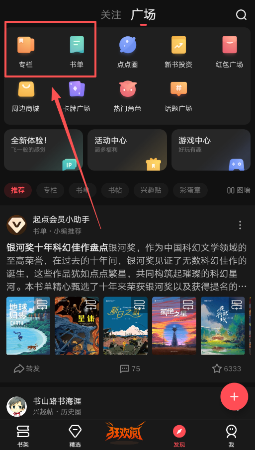 2、发现页有更多互动功能,像是书单、专栏和话题广场,可以找到同好或参与讨论。