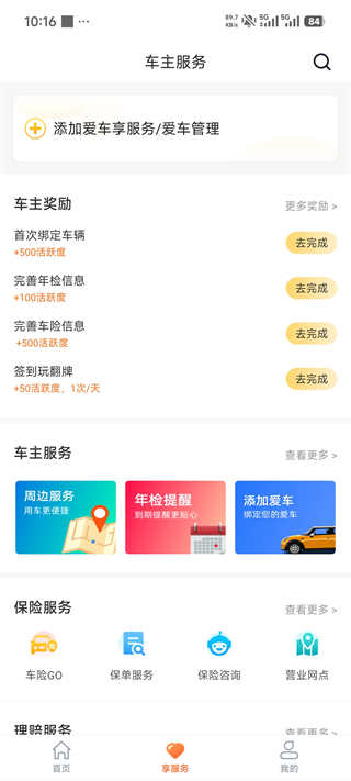 支持添加爱车绑定车辆,可完成绑定车辆、完善年检 / 车险信息等任务获取活跃度,同时提供周边服务、年检提醒等车主专属服务。