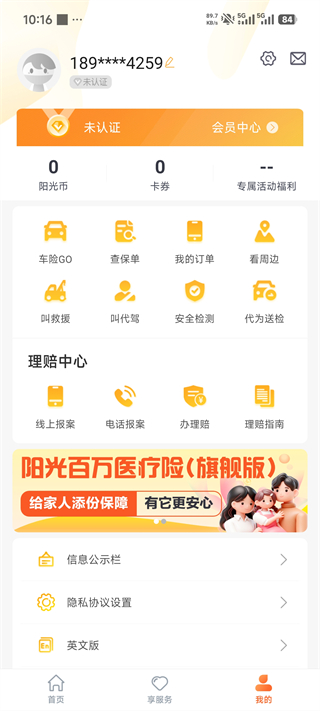 集中管理车险、保单、订单等个人业务,整合线上报案、叫救援等理赔服务入口,还可查看会员权益与专属保险产品。