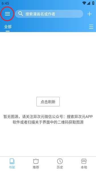 1、下载安装好软件后即可发现里面都是空空的,这时是需要用户自行添加图源的,首先点击右上角菜单按钮