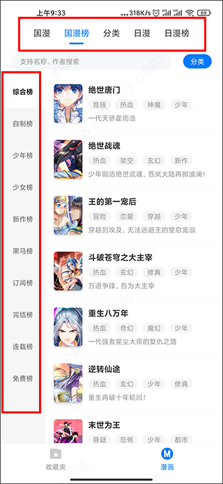 2、其中主要把漫画划分为了国漫、日漫,同时为了防止漫迷们找不到好看的漫画,还提供了排行榜以供参考;