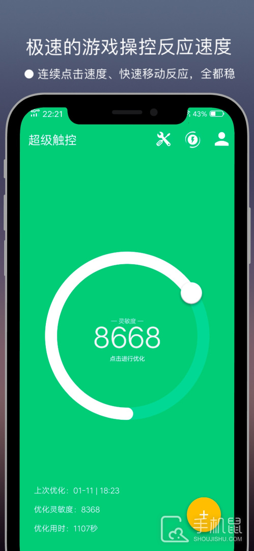 1、下载安装超级触控app,打开后拖动中间的圆点即可调整触控;
